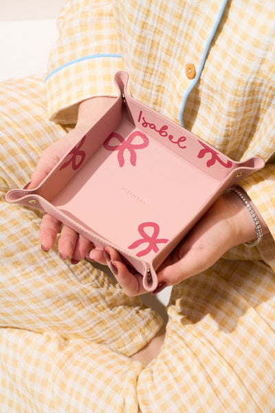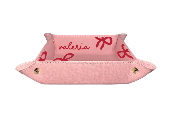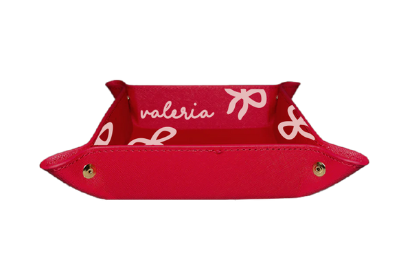 Organiza cualquier superficie con el Valet Tray en cuero saffiano. Perfecto para escritorios, mesitas de noche o en la entrada de la casa, puedes utilizarlo para colocar tus artículos esenciales y mantenerlos en orden con estilo.