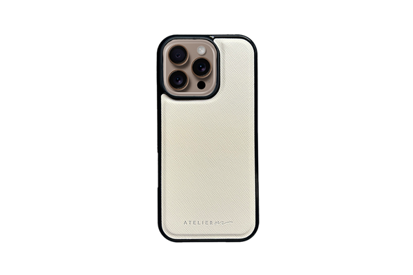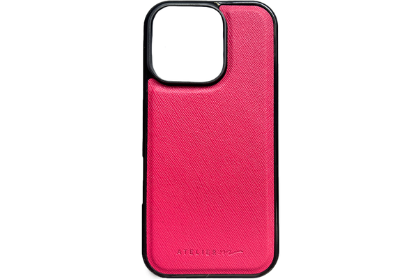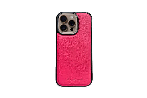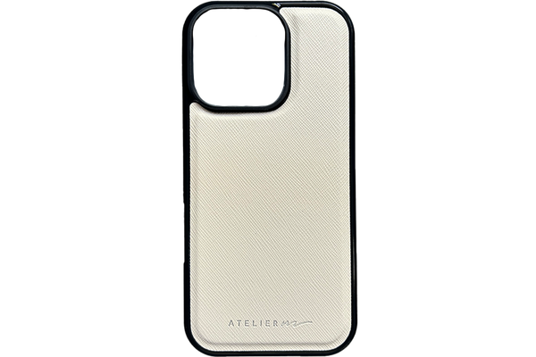 Make it personal con el SIGNATURE CASE: cuero saffiano y marco negro, compatible con MagSafe.