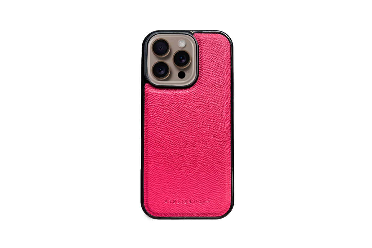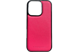 Make it personal con el SIGNATURE CASE: cuero saffiano y marco negro, compatible con MagSafe.
