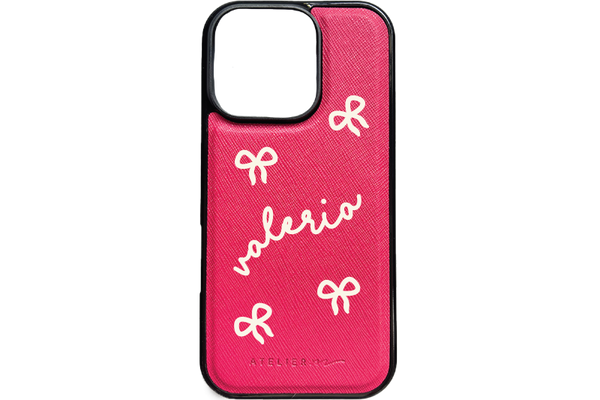 Make it personal con el SIGNATURE CASE: cuero saffiano y marco negro, compatible con MagSafe.